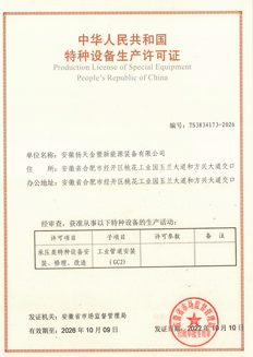 公司具有A2級(jí)壓力容器設(shè)計(jì)、制造資質(zhì),壓力管道(GB類、GC類)設(shè)計(jì),壓力管道(GC類)安裝資質(zhì)、壓力管道特種元件制造資質(zhì)等,通過了軍選民用裝備承制資格A類、武器裝備質(zhì)量管理體系、ISO9001質(zhì)量管理體系、ISO14001環(huán)境管理體系、OHSAS18001職業(yè)健康安全管理體系、兩化融合管理體系、企業(yè)AAA信用等級(jí)的評(píng)定認(rèn)證。我公司自主研發(fā)多項(xiàng)專利技術(shù),部分產(chǎn)品通過了省級(jí)新產(chǎn)品鑒定及安徽省首臺(tái)套重大技術(shù)裝備產(chǎn)品認(rèn)定,同時(shí)獲得合肥市專精特新中小企業(yè)、合肥市知識(shí)產(chǎn)權(quán)示范企業(yè)、合肥市工業(yè)設(shè)計(jì)中心、合肥市企業(yè)技術(shù)中心、合肥市數(shù)字化車間、安徽省科技型中小企業(yè)、安徽省創(chuàng)新型中小企業(yè)、合肥市優(yōu)質(zhì)小微企業(yè)等多項(xiàng)榮譽(yù),產(chǎn)品被納入《肥西縣裝備制造業(yè)產(chǎn)品推介目錄(2020年版)》,是集壓力容器設(shè)計(jì)、制造、銷售和工程安裝為一體的專業(yè)化生產(chǎn)企業(yè),同時(shí)也是安徽省最早成立的特種焊工培訓(xùn)及考試定點(diǎn)機(jī)構(gòu)之一。