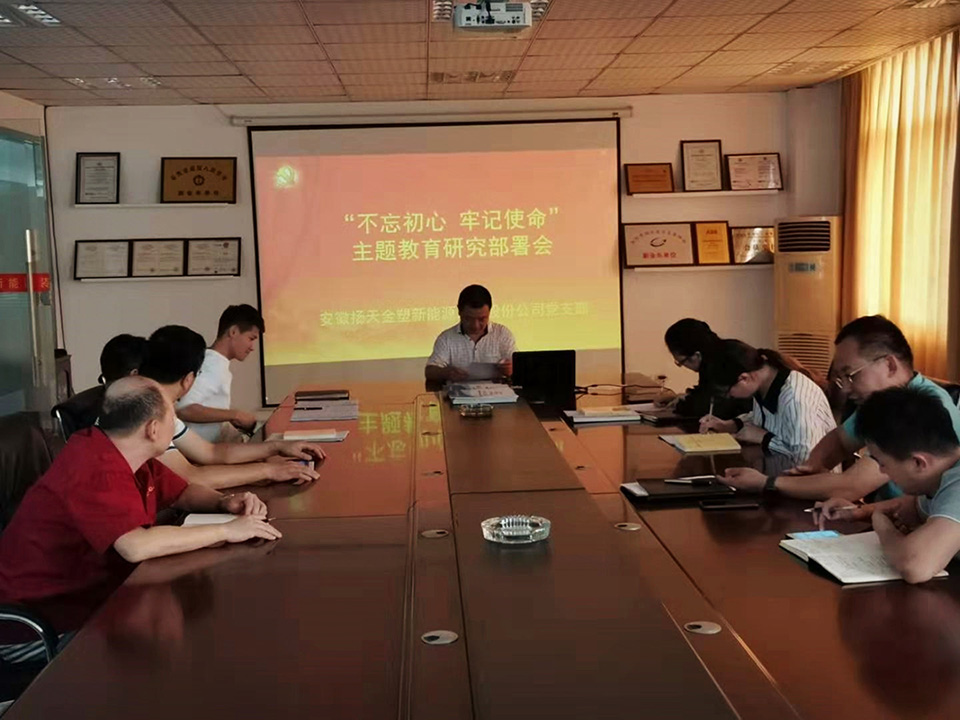 2019年9月25日上午,為深入賈徹習近平總書記在“不忘初心、牢記使命"主題教育工作會議上重要講話精神,安徽揚天金塑新能源裝備股份限公司(以下簡稱揚天金塑)召開“不忘初心、牢記使命”主題教育工作部署會議,公司總經理邵天、CIO王建祥及黨支部書記、支部委員、主題教育工作組成員參會。公司總經理邵天同志作工作部暑講話,支部書記趙講用主持會議。