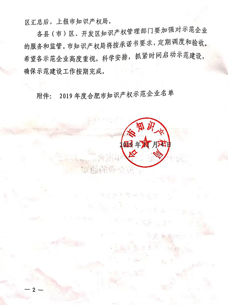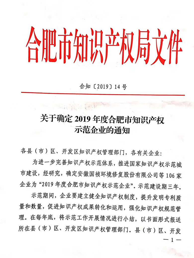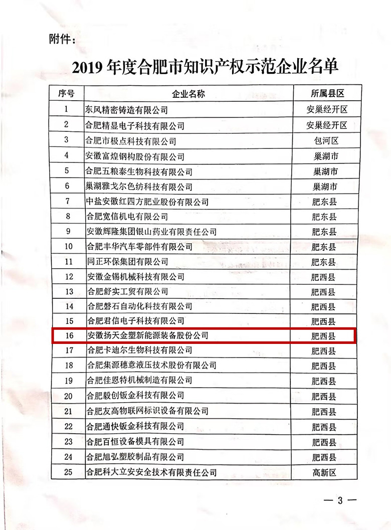 2019年11月4日,合肥知識產權局下發了關于確定“2019年度合肥市知識產權示范企業”的通知,經過專家組的嚴格評審,安徽揚天金塑新能源裝備股份公司被評定為“合肥市知識產權示范企業”。