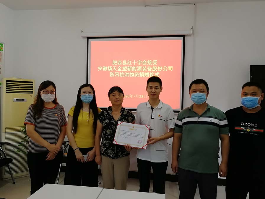 天災無情人有情,一方有難八方支援。作為一個深耕于安徽的本土企業,安徽揚天金塑新能源裝備股份公司始終不忘初心,用實際行動關愛和回饋社會,時刻不忘肩負社會責任。相信在黨中央、國務院、各級人民政府及社會各屆的共同努力下,我們定能風雨同舟,攜手共進,共克時艱,擊退洪流,共筑美好!