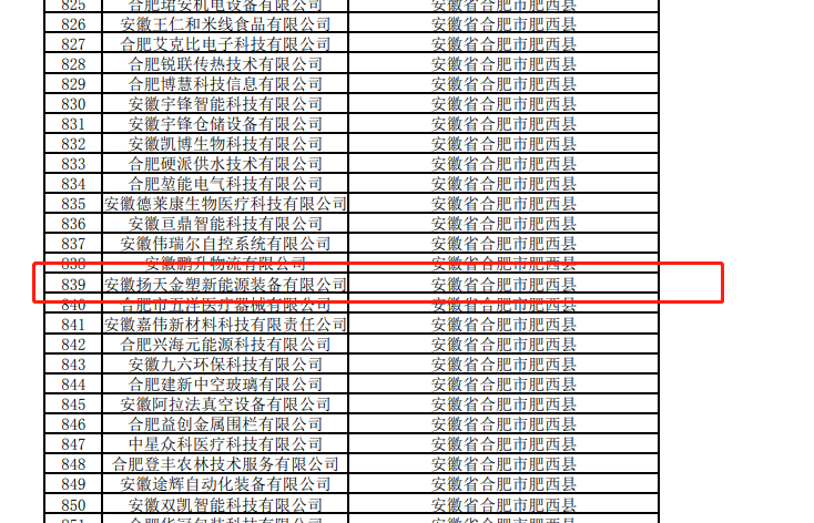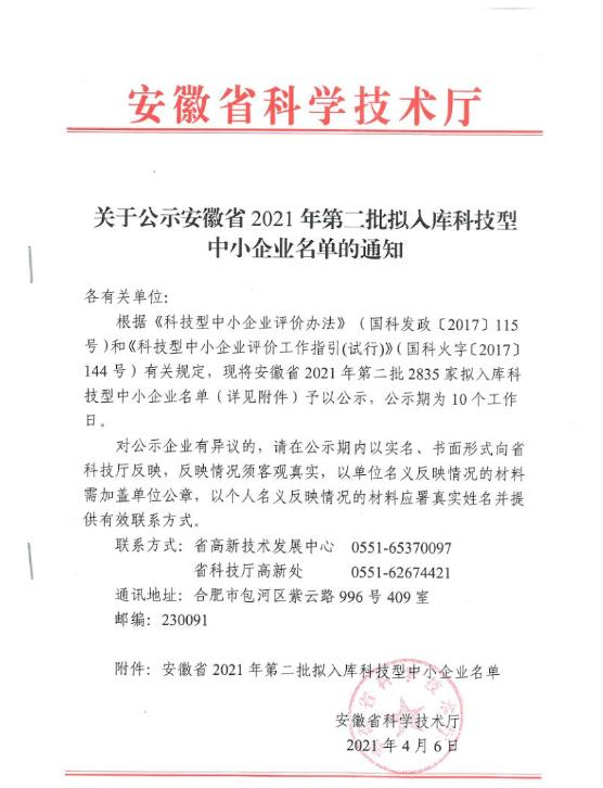 2021年4月6日,安徽省科學技術廳公布2021年度安徽省“國家科技型中小企業”名單,安徽揚天金塑新能源裝備有限公司成為2021年度第二批“國家科技型中小企業”。